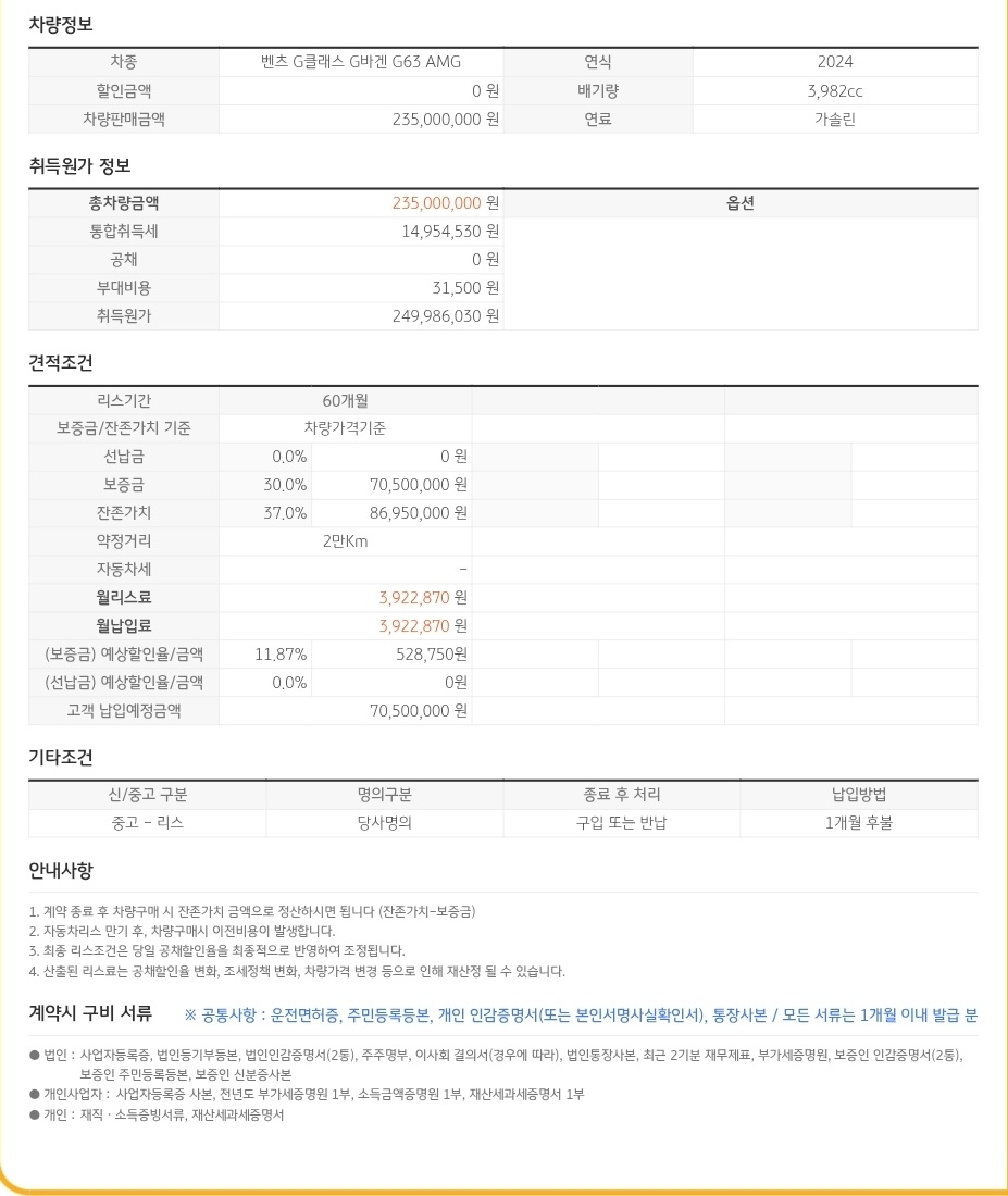 ▲ 딜러에게 받은 벤츠 G63 AMG 리스 견적서