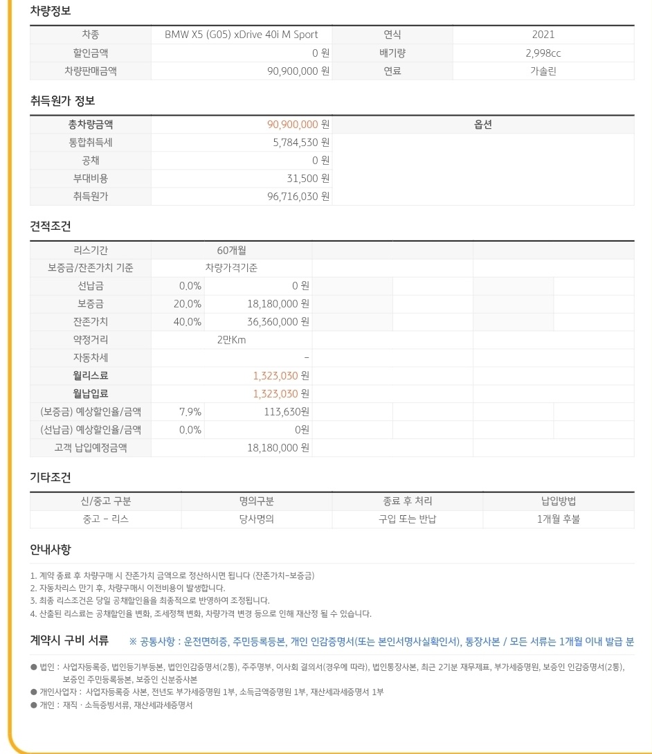 고객님은 "가족들과 탈 차라 안전한 X5를 원하는데, 금리가 너무 비싸서 고민"이라고 하셨습니다. 저희는 긴말하지 않고, 취득원가부터 잔존가치까지 1원 단위까지 적힌 견적서를 드렸습니다.