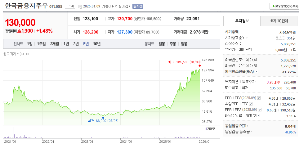 한국금융지주우는 **'주가 상승 + 고배당'**을 동시에 노릴 수 있는 매력적인 종목입니다. 2025년 예상 실적대로 배당이 7,000원대가 된다면, 지금 가격(13만 원)도 결코 비싼 게 아닐 수 있습니다.